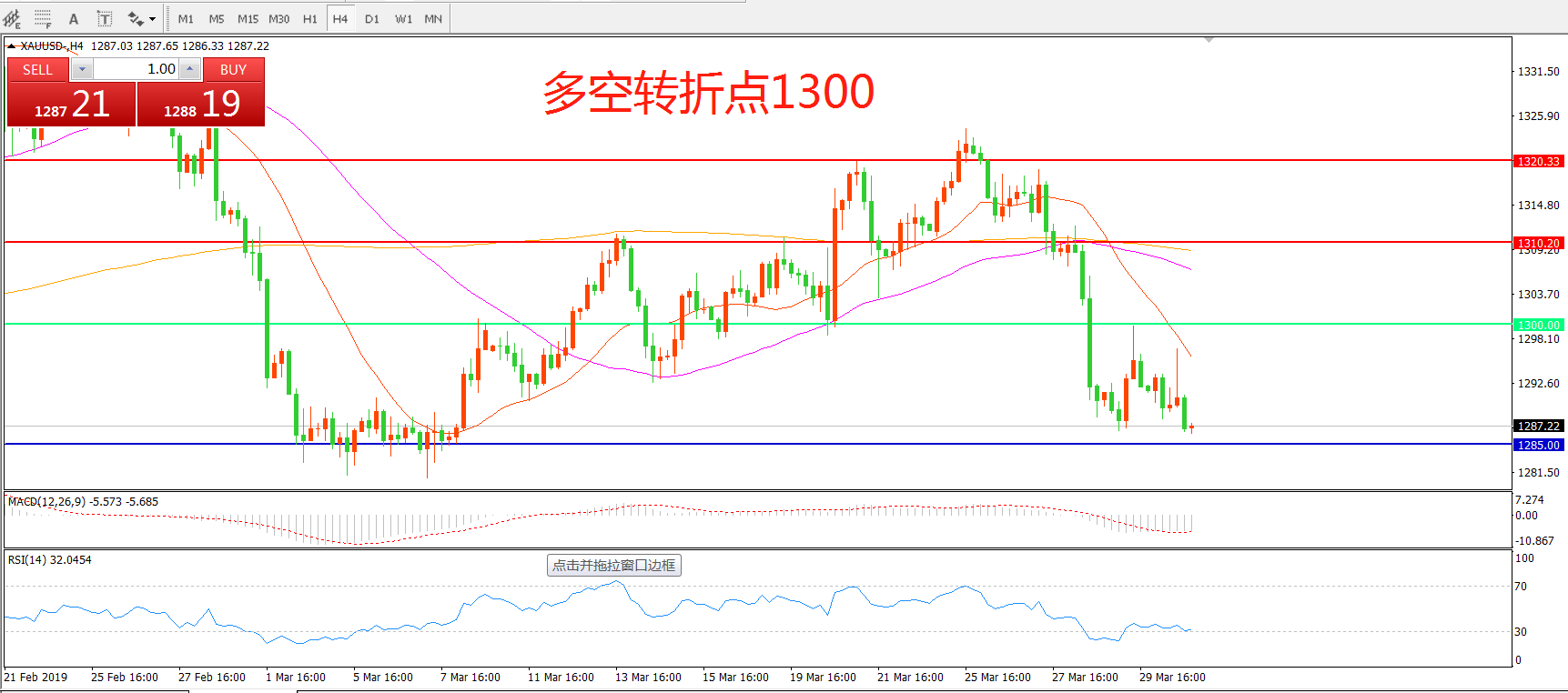 4小时图图看,金价连续长阴下破,跌破千三心理关口,整体形态偏弱。连续两日冲高回落显示多头动能较弱。均线系统拐头向下,MACD绿柱增加,弱势震荡概率较大,重点关注1285美元一线支撑力度。