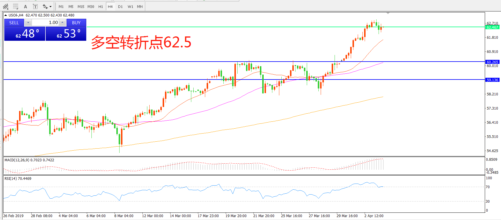 美国能源信息署(EIA)周三(4月3日)公布报告显示,上周美国原油库存再度大增,但汽油和精炼油库存则继续下降,此外,上周美国国内原油产量增加10万桶至1220万桶/日,再创纪录新高。这令原油多头信心受挫。美国WTI原油价格盘中最低触及62.06美元/桶,最终收报62.46美元/桶