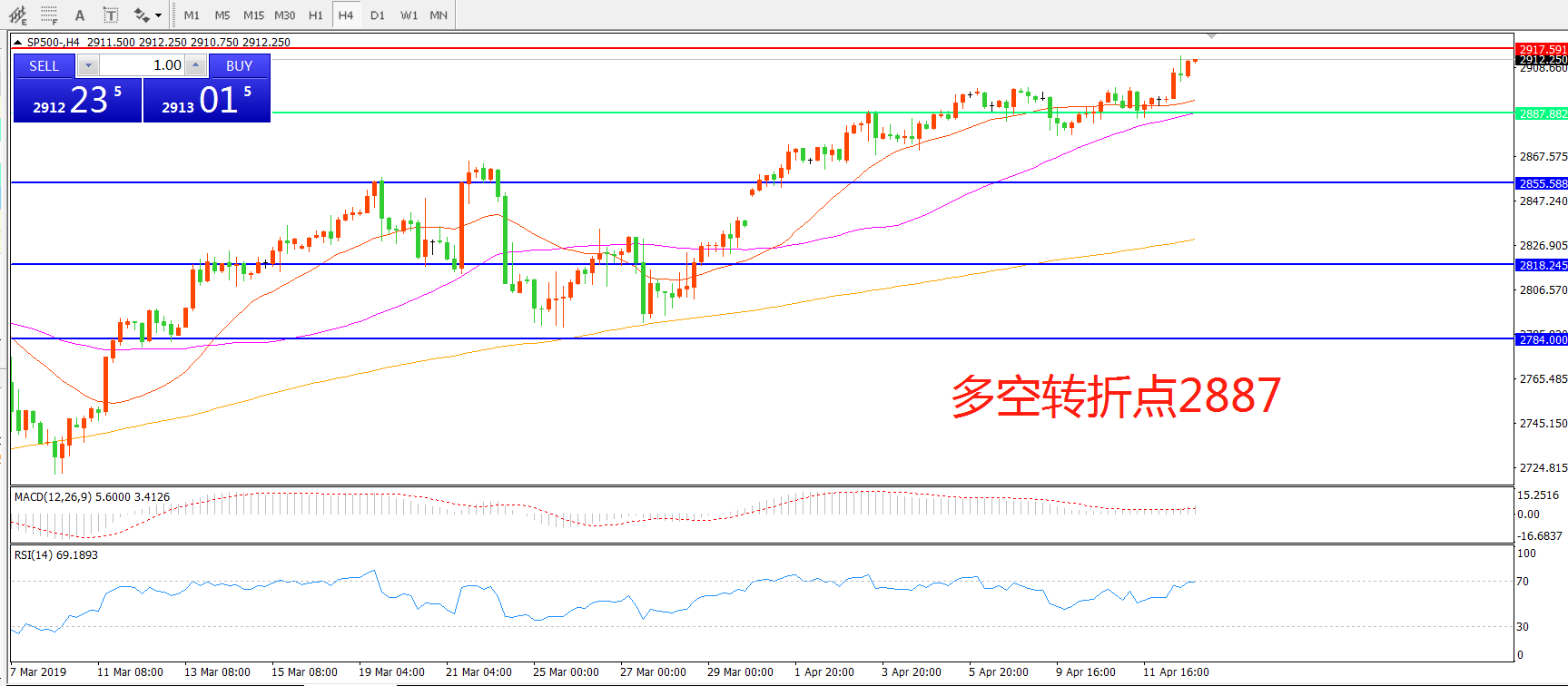 4小时图看,标普500以21均线为支撑延续震荡上行走势,短期走势偏强, MACD红柱缩短,RSI指标向上,日内依然维持多头思路。