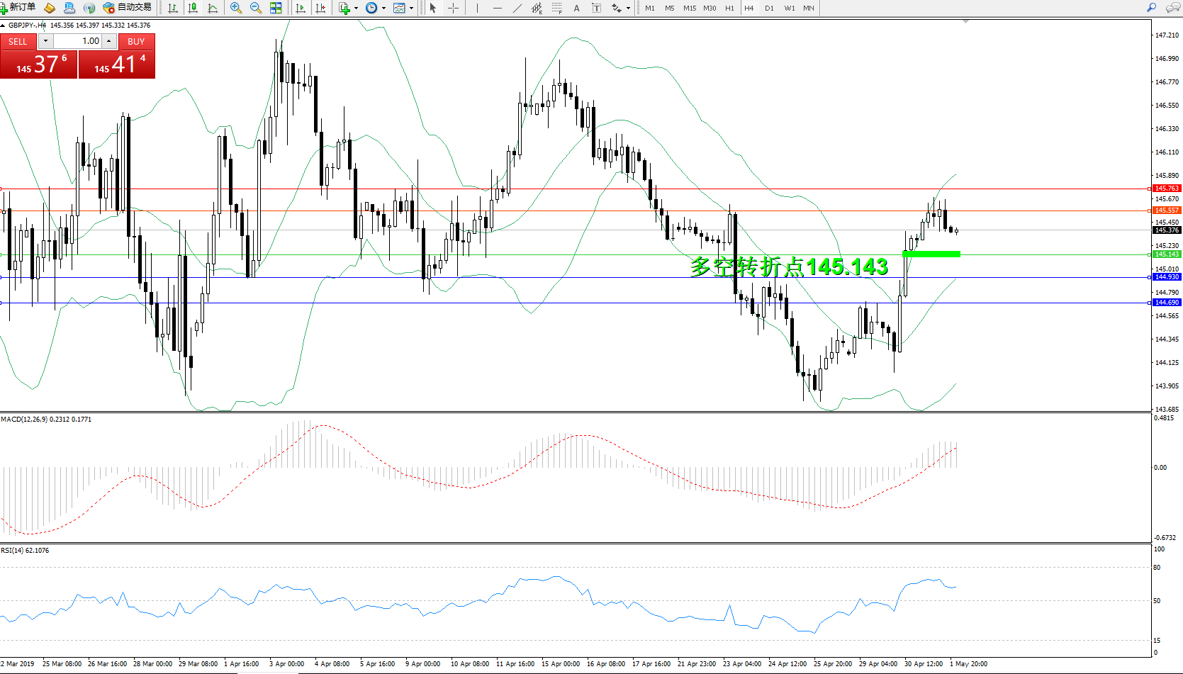 交易策略:145.143上方看涨,目标145.557、145.763