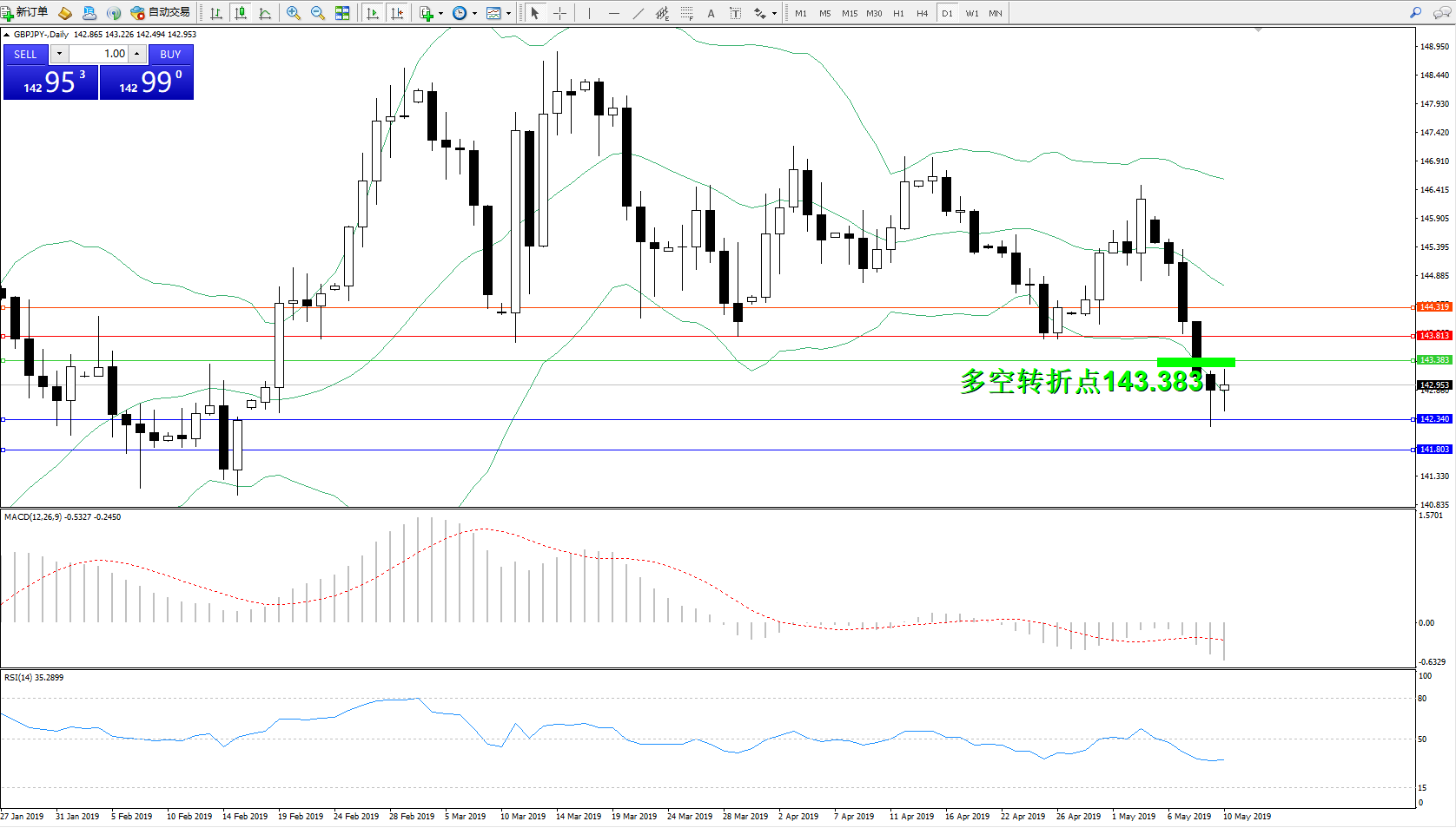 备选策略:143.383上方看涨,目标143.813、144.319