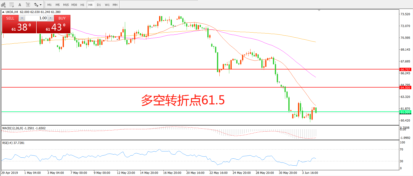 交易策略:在61.50之下看跌,目标57.50 53.00