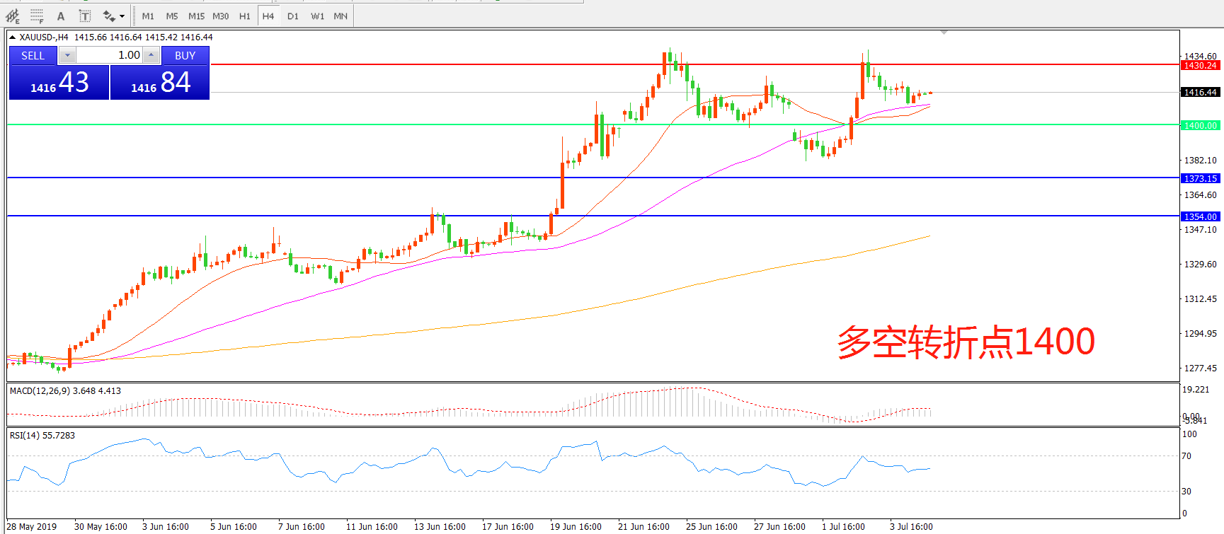 周四(7月4日),金价维持窄幅震荡,整体波动幅度不超过5美元。由于美国独立日假期,市场交投非常清淡,各主要金融品种波动幅度都非常有限。日内金价录得小幅下跌,收报1421.9美元/盎司。