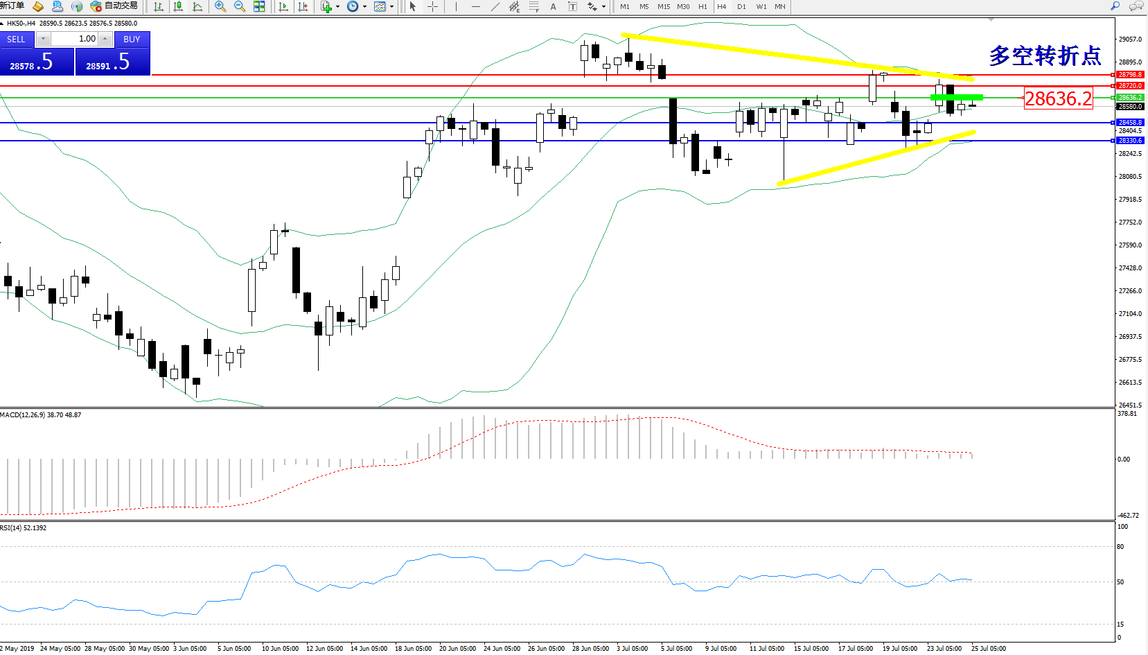 香港恒生指数7月25日(周四)收盘上涨70.26点,涨幅0.25%,报28594.30点;港股现时继续处于横行拉锯格局,某程度上要突破相当有难度,皆因外势包括贸易谈判及联储局议息结果下周才有较多消息,后市或继续维持28000至29000点附近波动不变。近期A股偏强走势有望给恒指带来一定支持。各国央行对货币具体举措将影响市场走势,因此,料港股短期震荡走势。