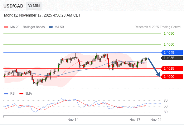 在 1.4045 之下,看跌,目标价位为 1.4015 ,然后为 1.4000 。