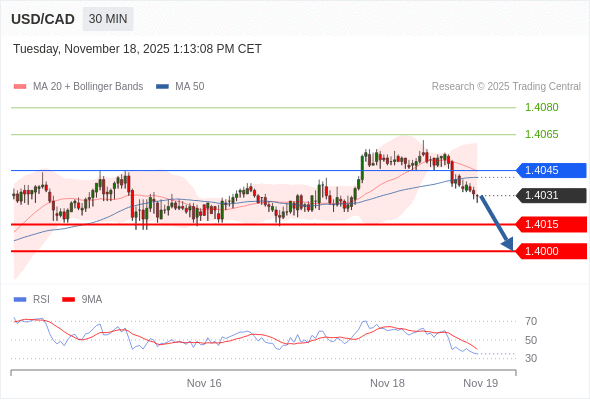 在 1.4045 之下,看跌,目标价位为 1.4015 ,然后为 1.4000 。