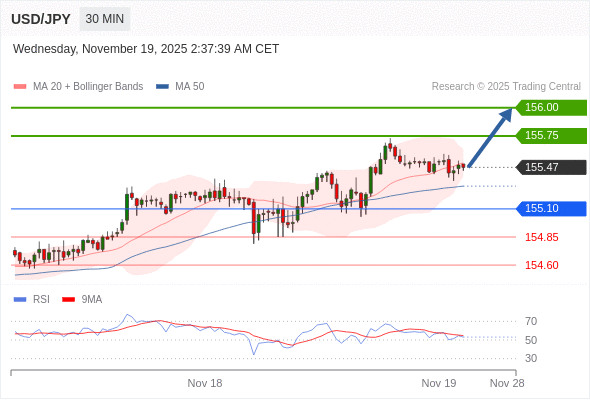 在 155.10 之上,看涨,目标价位为 155.75 ,然后为 156.00 。