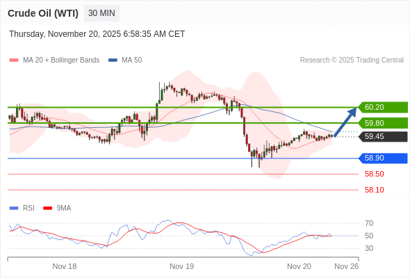 在 58.90 之上,看涨,目标价位为 59.80 ,然后为 60.20 。