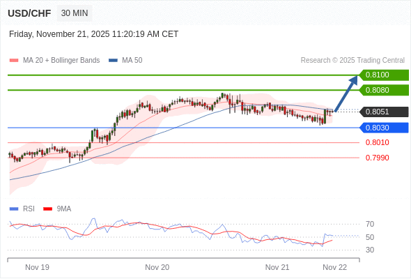 在 0.8030 之上,看涨,目标价位为 0.8080 ,然后为 0.8100 。