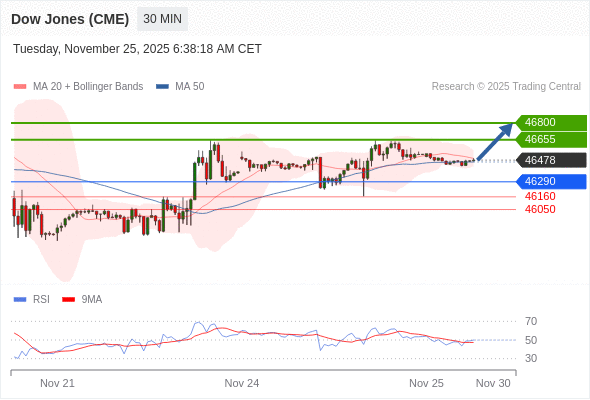 在 46290 之上,看涨,目标价位为 46655 ,然后为 46800 。