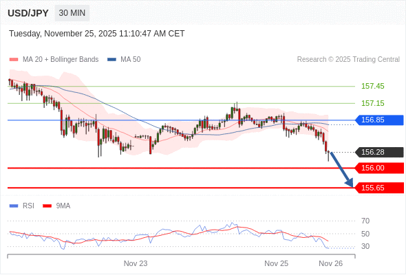 在 156.85 之下,看跌,目标价位为 156.00 ,然后为 155.65 。