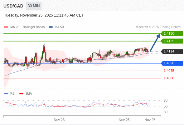 在 1.4090 之上,看涨,目标价位为 1.4135 ,然后为 1.4150 。