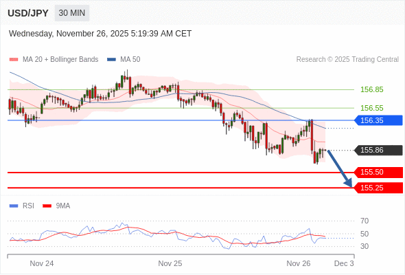 在 156.35 之下,看跌,目标价位为 155.50 ,然后为 155.25 。