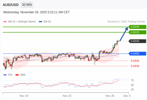 在 0.6465 之上,看涨,目标价位为 0.6525 ,然后为 0.6540 。