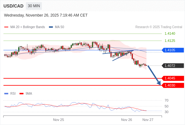 在 1.4105 之下,看跌,目标价位为 1.4045 ,然后为 1.4030 。
