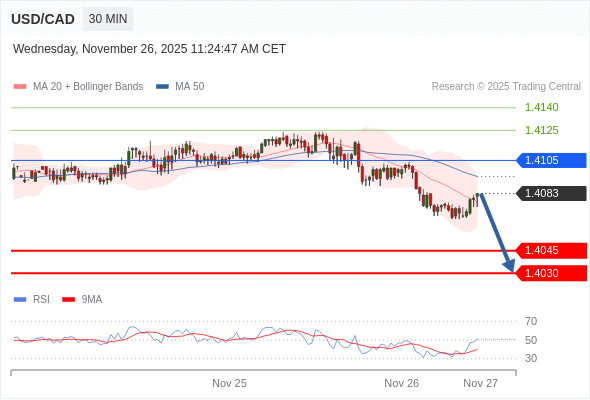 在 1.4105 之下,看跌,目标价位为 1.4045 ,然后为 1.4030 。