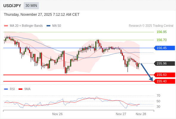 在 156.45 之下,看跌,目标价位为 155.60 ,然后为 155.40 。