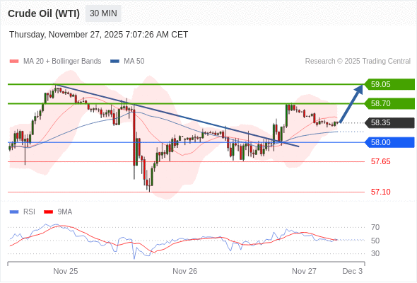 在 58.00 之上,看涨,目标价位为 58.70 ,然后为 59.05 。