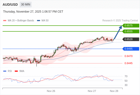 在 0.6495 之上,看涨,目标价位为 0.6555 ,然后为 0.6575 。