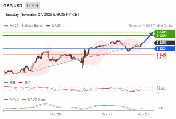英镑/美元 当日内 : 看涨,当 1.3224 为支撑位。