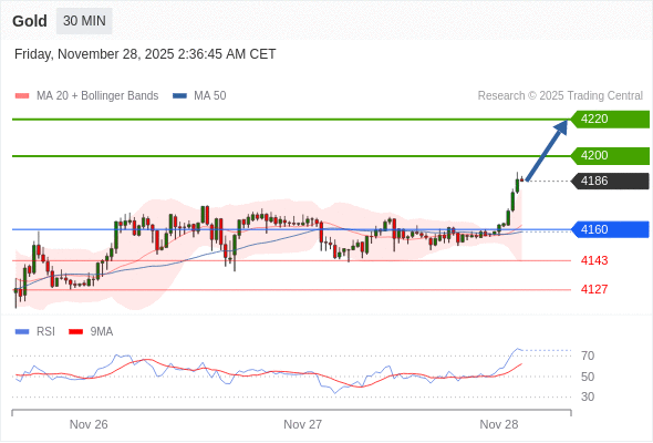 在 4160 之上,看涨,目标价位为 4200 ,然后为 4220 。