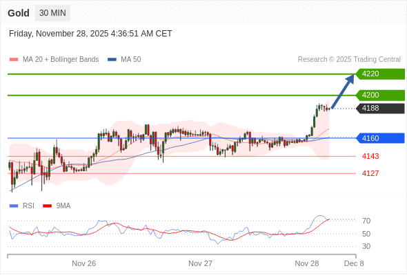 在 4160 之上,看涨,目标价位为 4200 ,然后为 4220 。