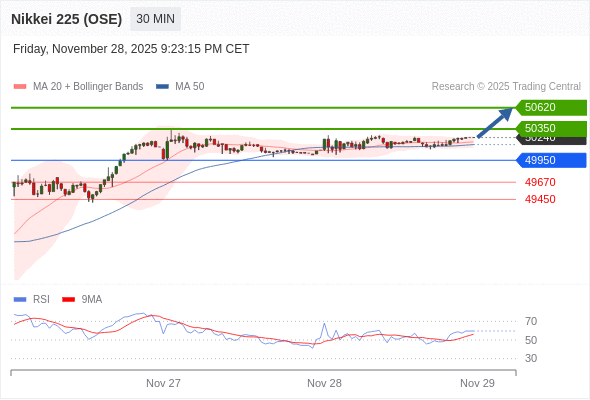 日经225股指期货 (OSE) 当日内: 在49950之上,看涨。