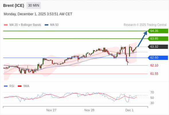 在 62.60 之上,看涨,目标价位为 63.85 ,然后为 64.35 。