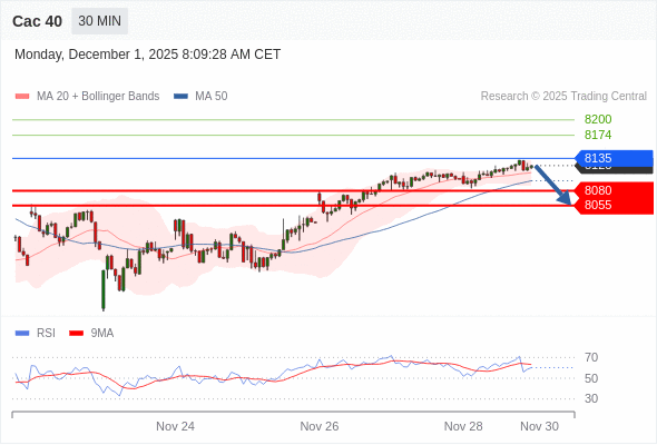 Cac 40 当日内: 短期关键阻力位在8135。
