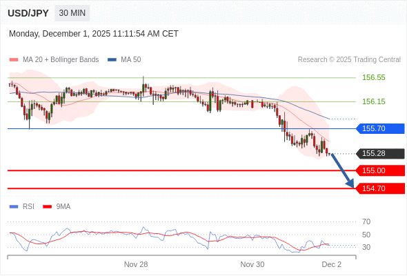 在 155.70 之下,看跌,目标价位为 155.00 ,然后为 154.70 。