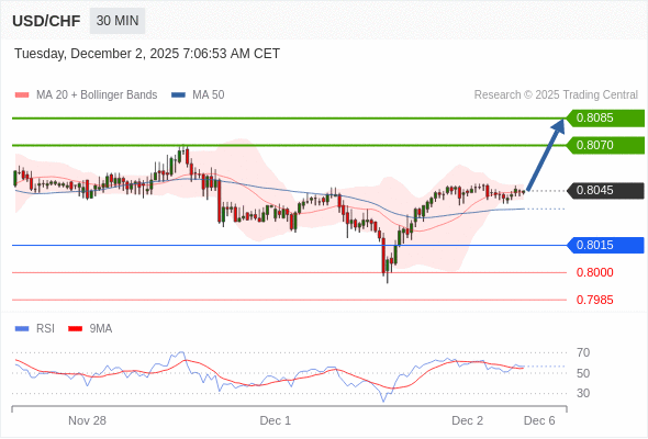 在 0.8015 之上,看涨,目标价位为 0.8070 ,然后为 0.8085 。