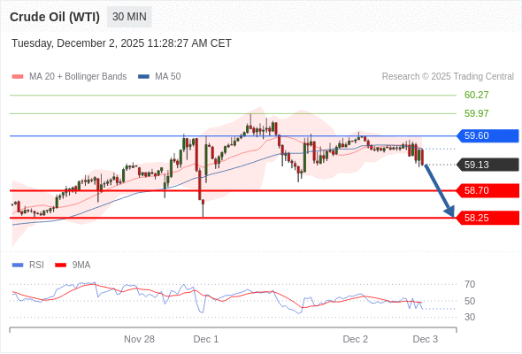 在 59.60 之下,看跌,目标价位为 58.70 ,然后为 58.25 。