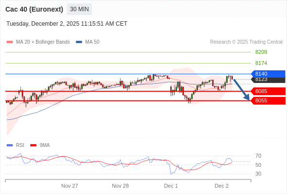 法国CAC指数期货 (Euronext) (Z5) 当日内: 短期关键阻力位在8140。