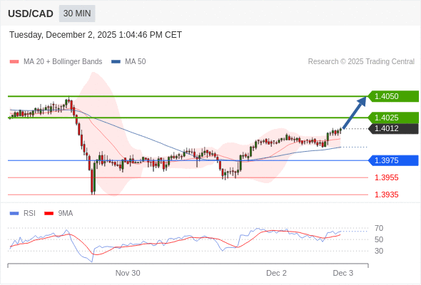 在 1.3975 之上,看涨,目标价位为 1.4025 ,然后为 1.4050 。