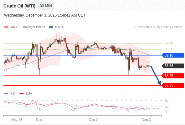在 59.10 之下,看跌,目标价位为 58.25 ,然后为 57.85 。