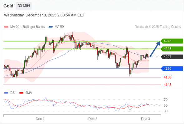 在 4180 之上,看涨,目标价位为 4225 ,然后为 4243 。
