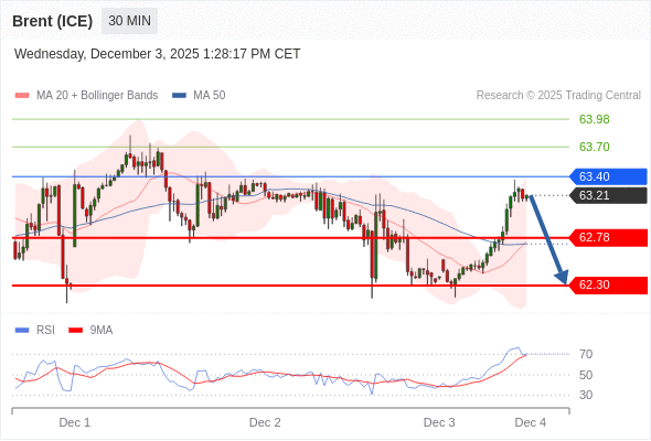在 63.40 之下,看跌,目标价位为 62.78 ,然后为 62.30 。