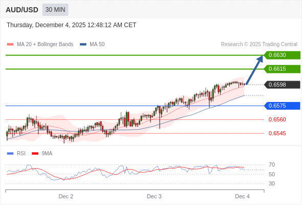在 0.6575 之上,看涨,目标价位为 0.6615 ,然后为 0.6630 。