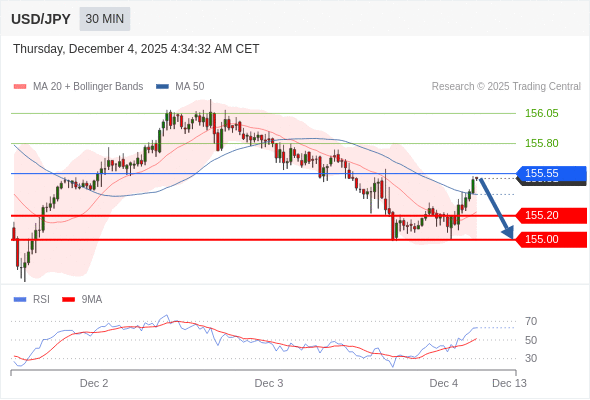 交易策略: 在 155.55 之下,看跌,目标价位为 155.20 ,然后为 155.00 。