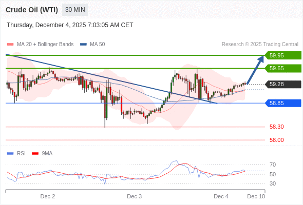 在 58.85 之上,看涨,目标价位为 59.65 ,然后为 59.95 。