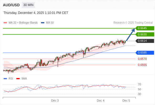 在 0.6585 之上,看涨,目标价位为 0.6630 ,然后为 0.6645 。