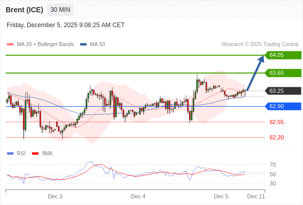 在 62.90 之上,看涨,目标价位为 63.65 ,然后为 64.05 。