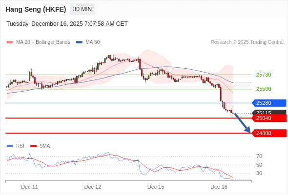 香港恒生指数期货 当日内: 下跌趋势。