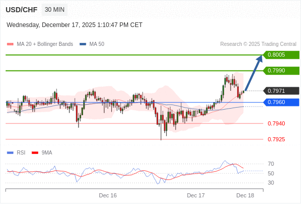 美元/瑞郎 当日内: 在0.7960之上,看涨。