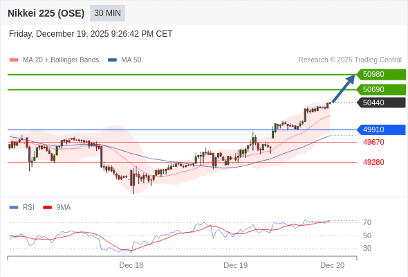 在 49910 之上,看涨,目标价位为 50690 ,然后为 50980 。