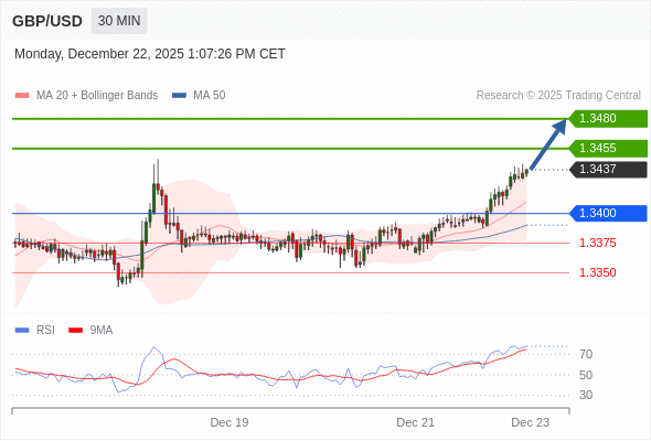 在 1.3400 之上,看涨,目标价位为 1.3455 ,然后为 1.3480 。