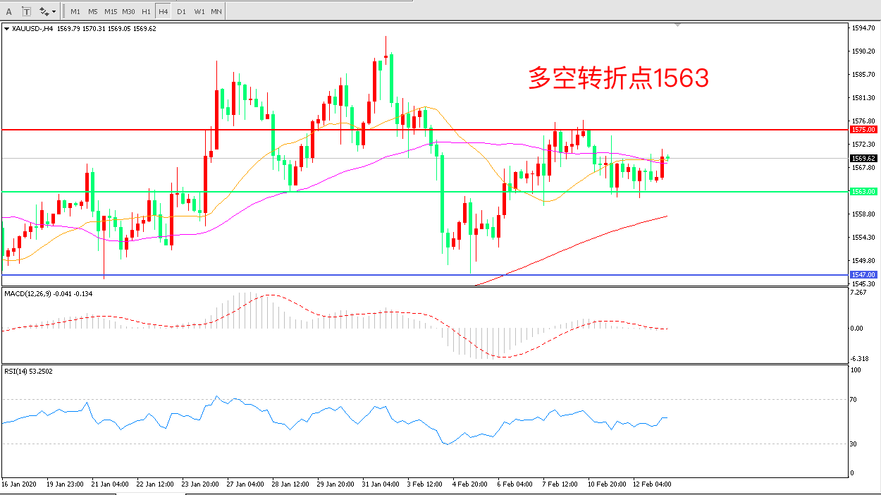4小时图看,金价呈现区间震荡形态,且振幅逐渐收窄,1563成为短期支撑,均线系统走平, MACD红柱缩短,RSI指标走平,日内延续震荡概率较大。