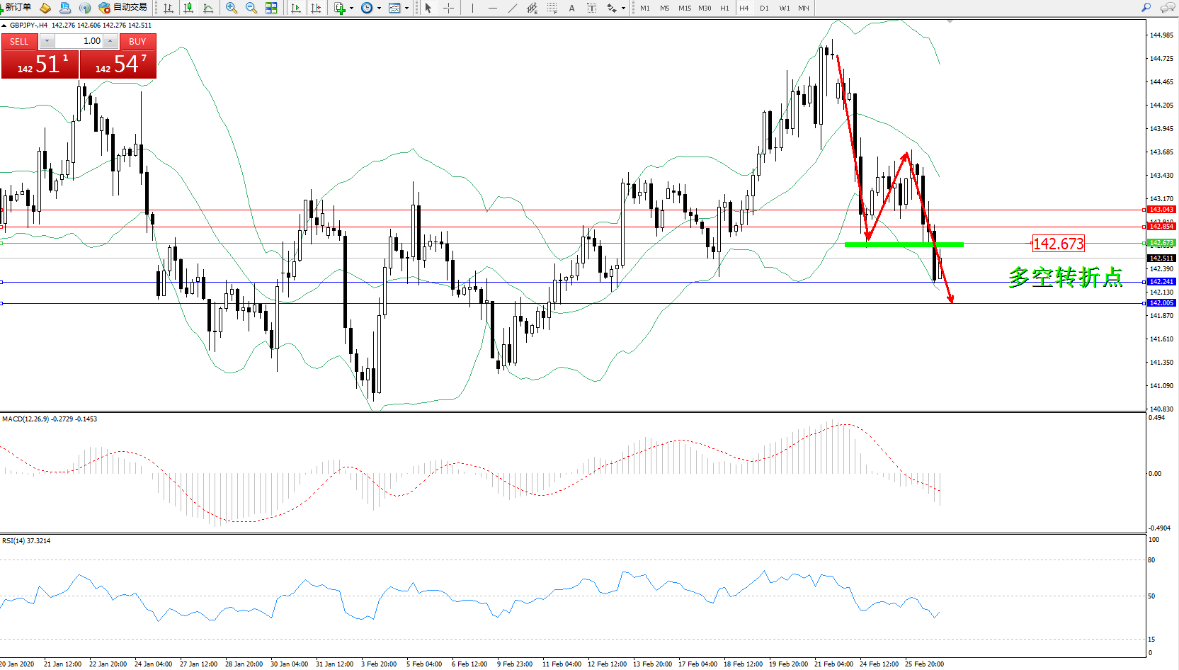 交易策略:142.673下方看跌,目标142.241、142.005