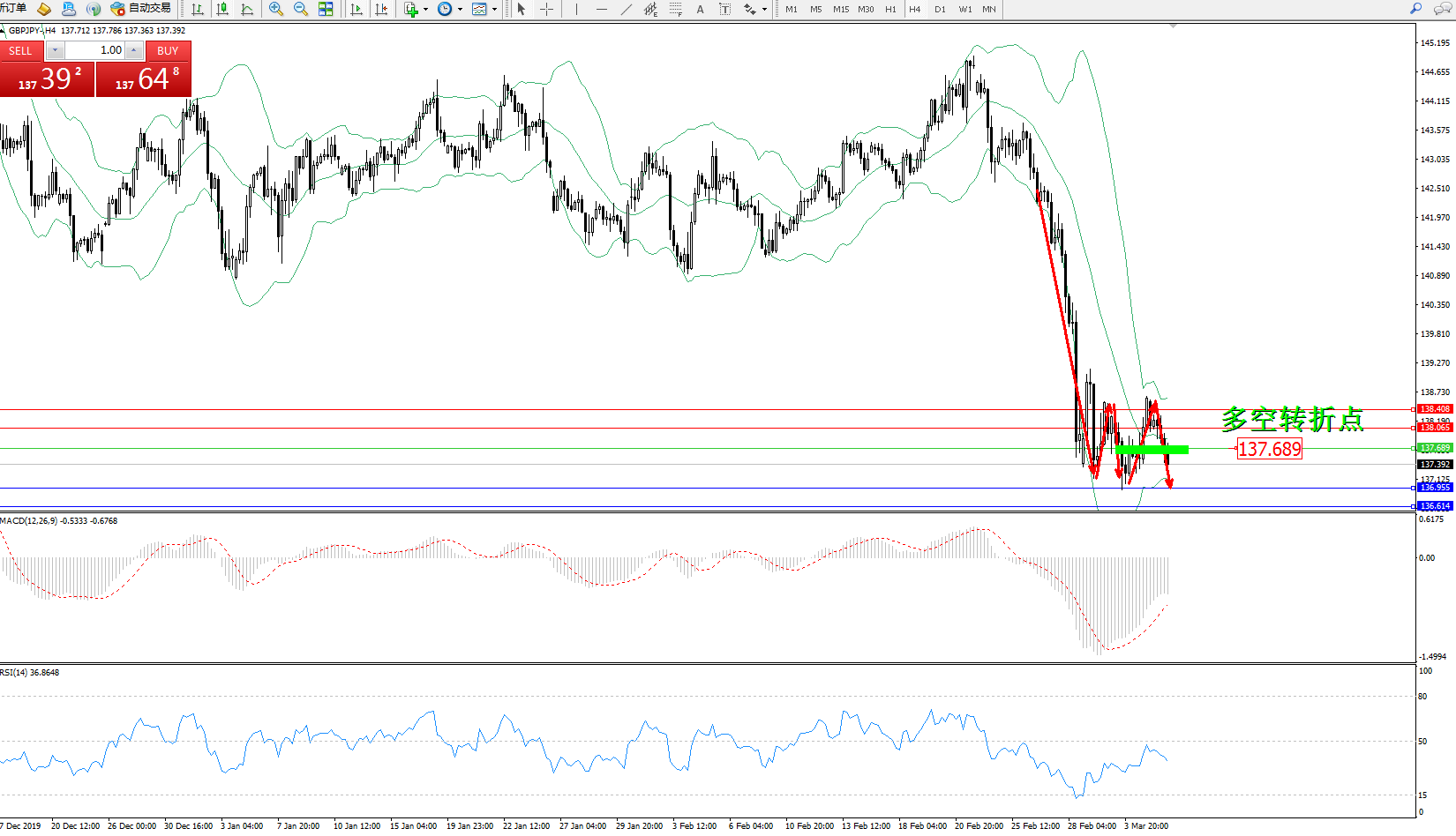 交易策略:137.689下方看跌,目标136.955136.614