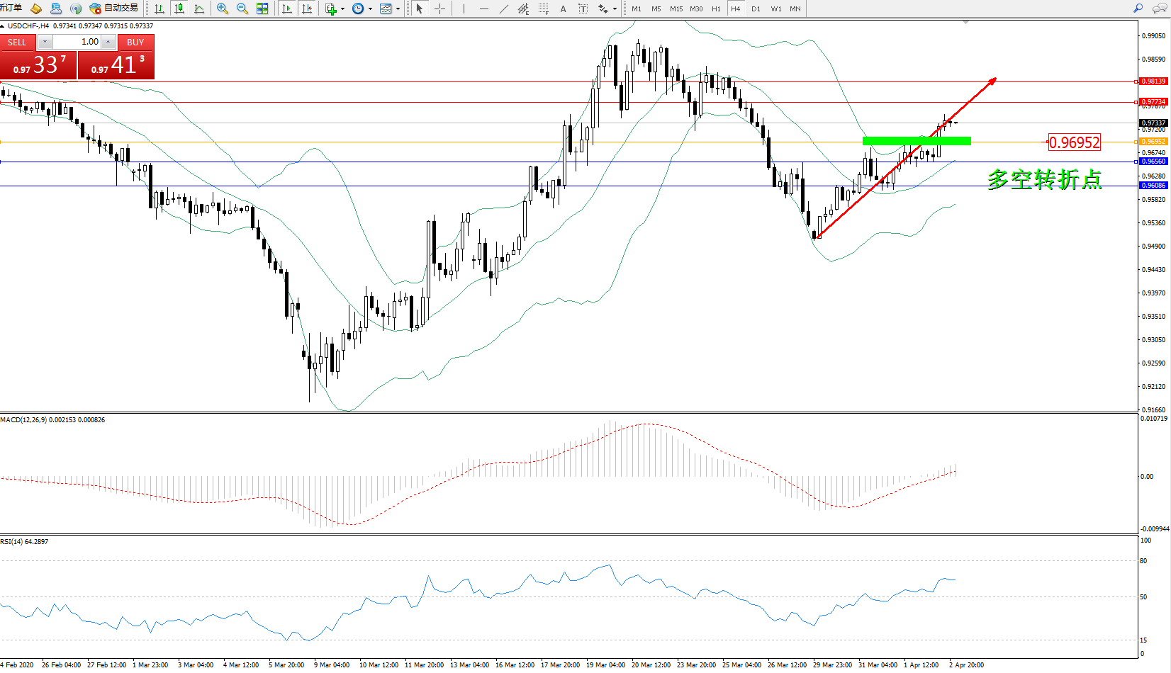 交易策略:0.96952上方看涨,目标0.97734、0.98129